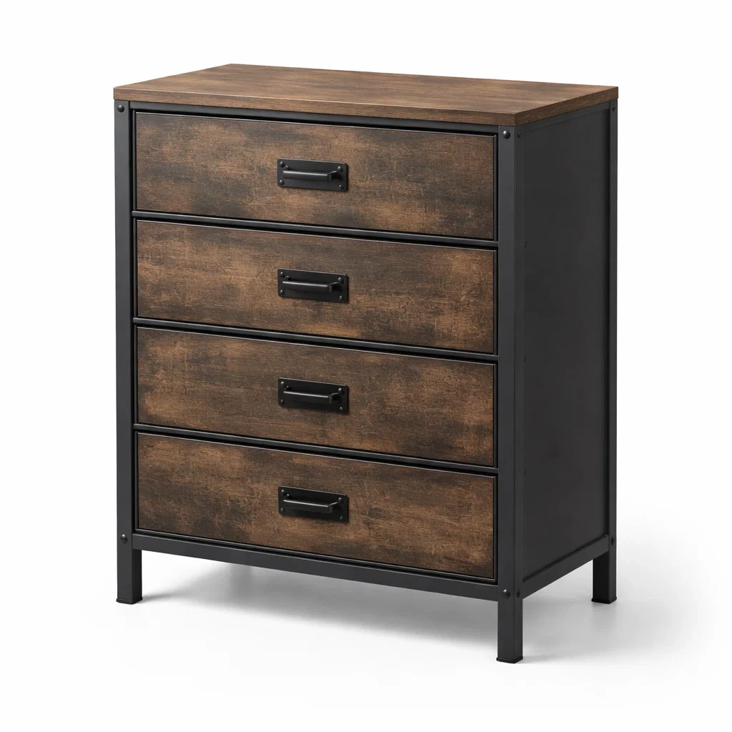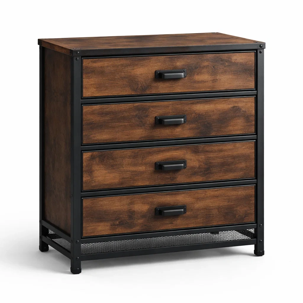 Cassettiera in legno e metallo marrone e nero con 4 cassetti