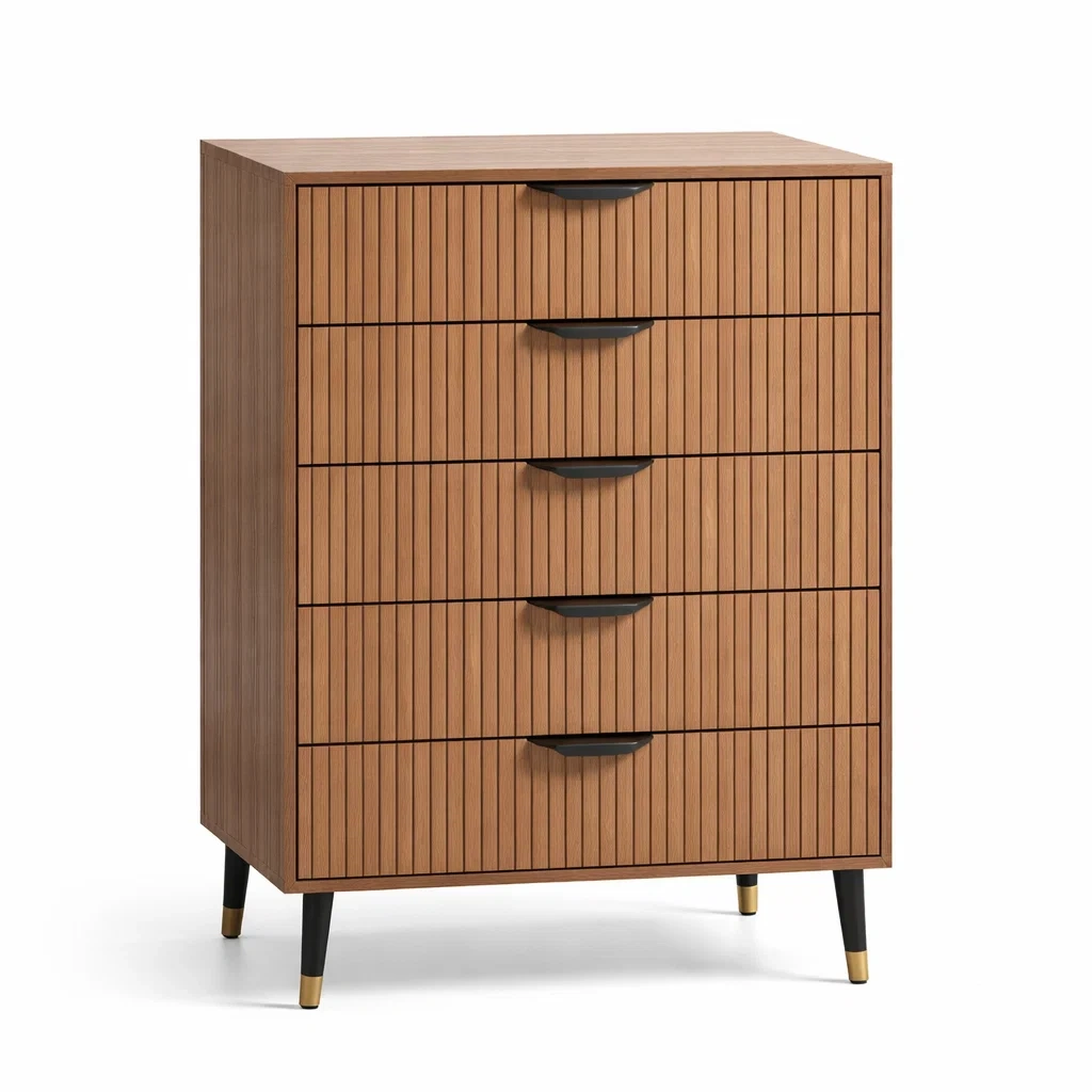 Cassettiera in legno melaminico marrone con 5 cassetti e gambe in metallo nero