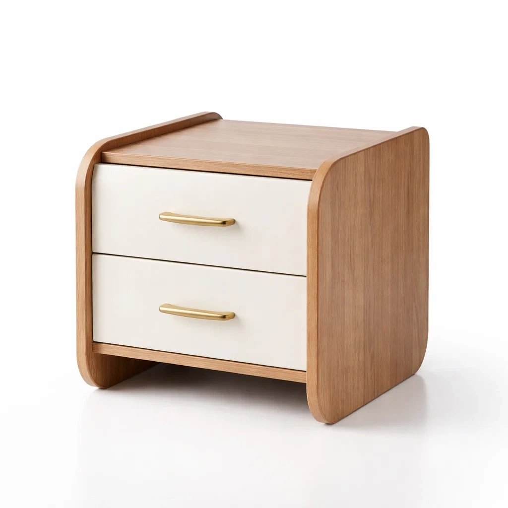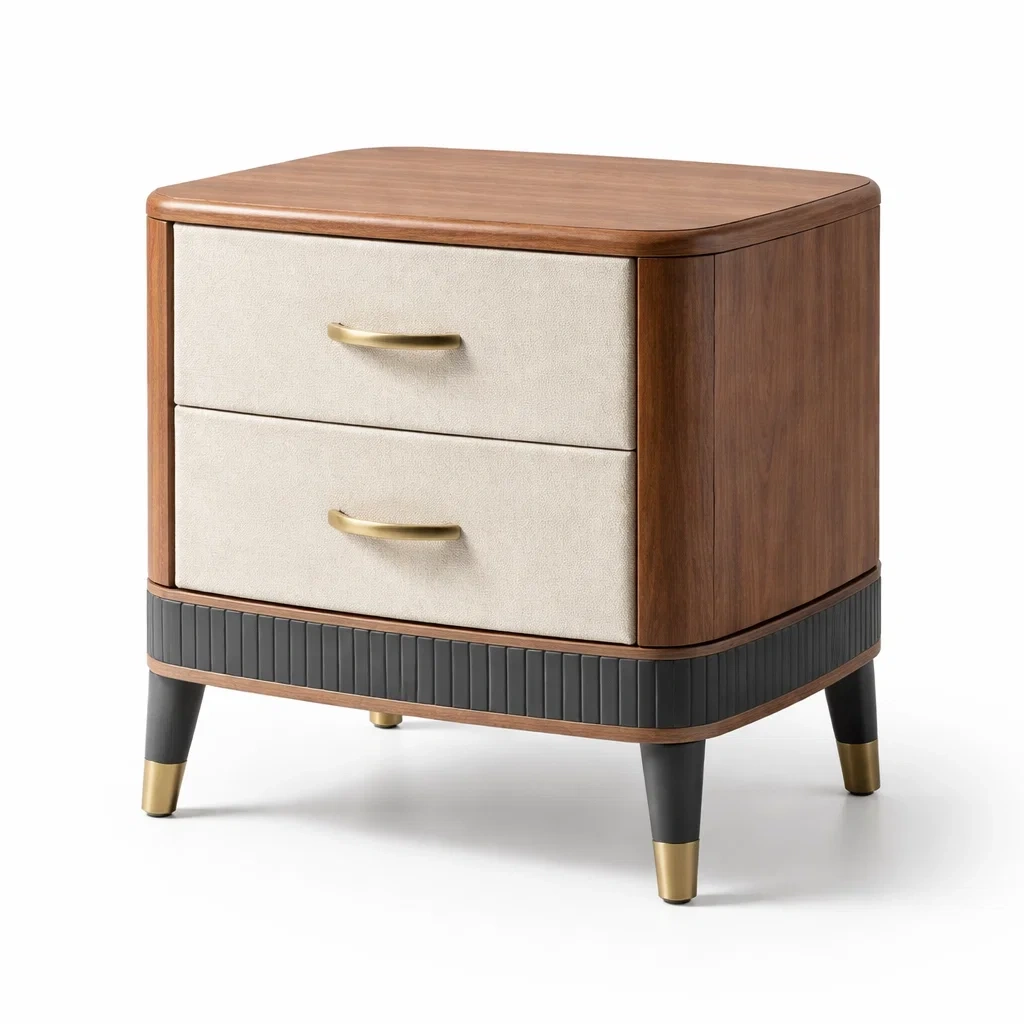 Comodino in legno con due cassetti in tessuto colore beige