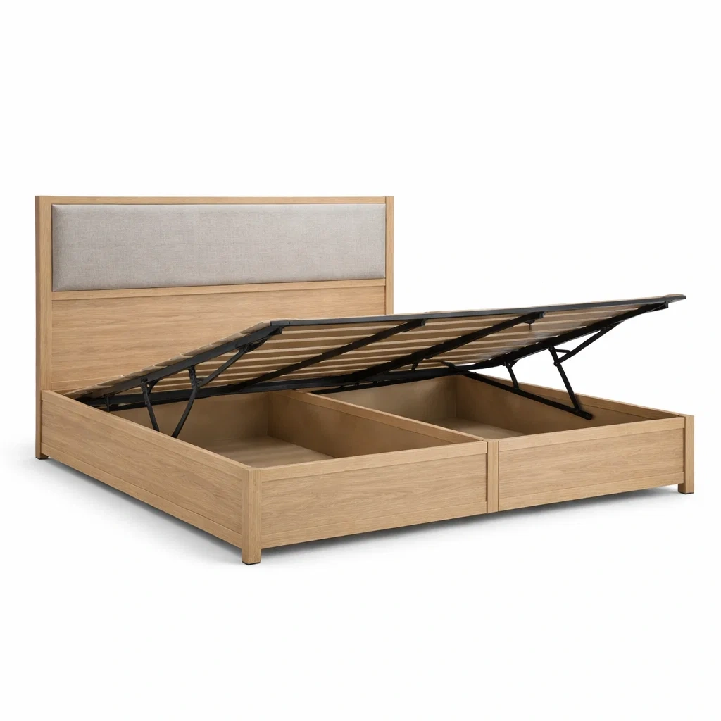 Letto contenitore in legno marrone con testiera in tessuto grigio