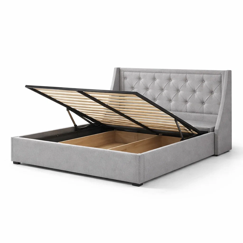 Letto contenitore in legno e tessuto grigio con testiera alta